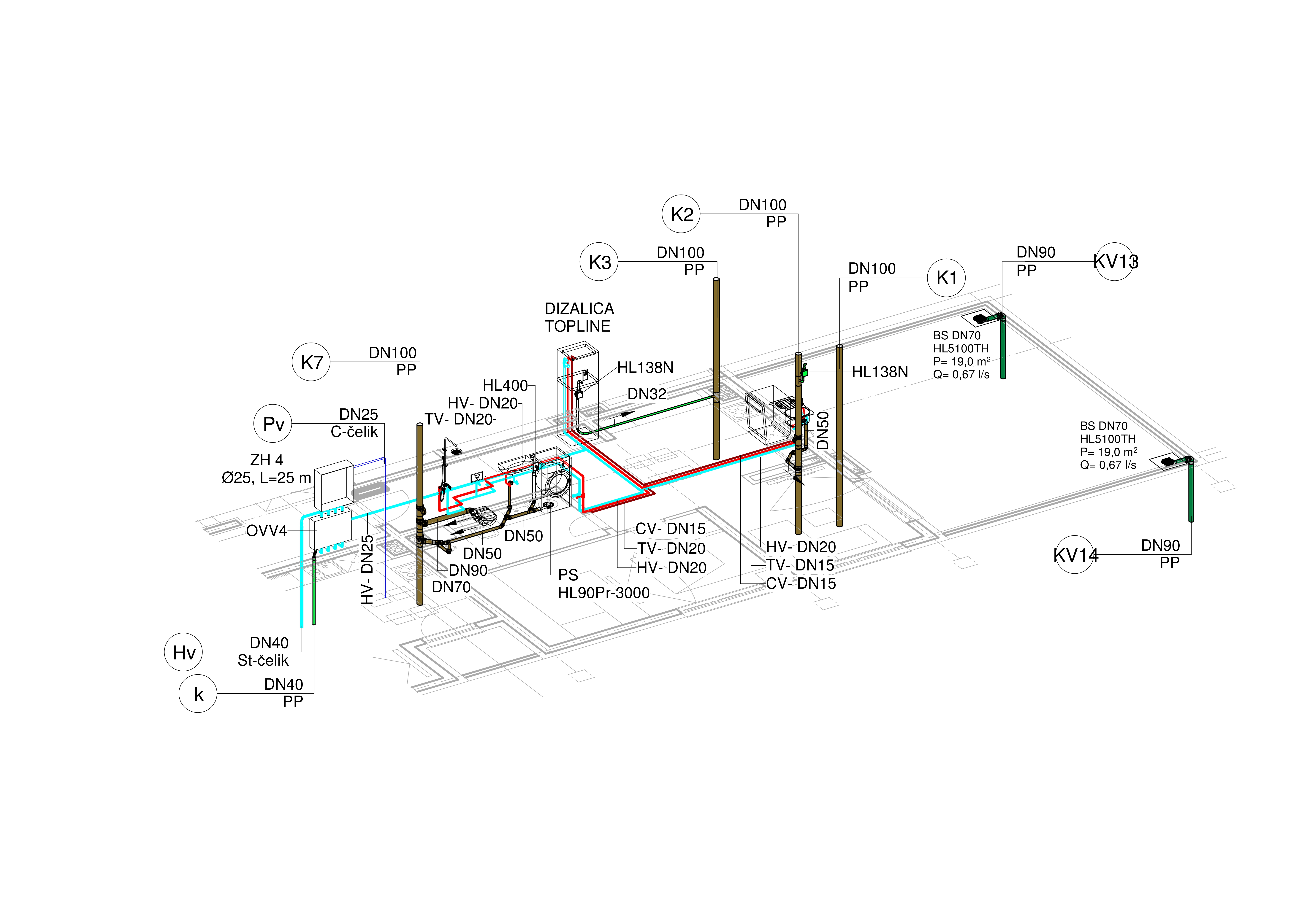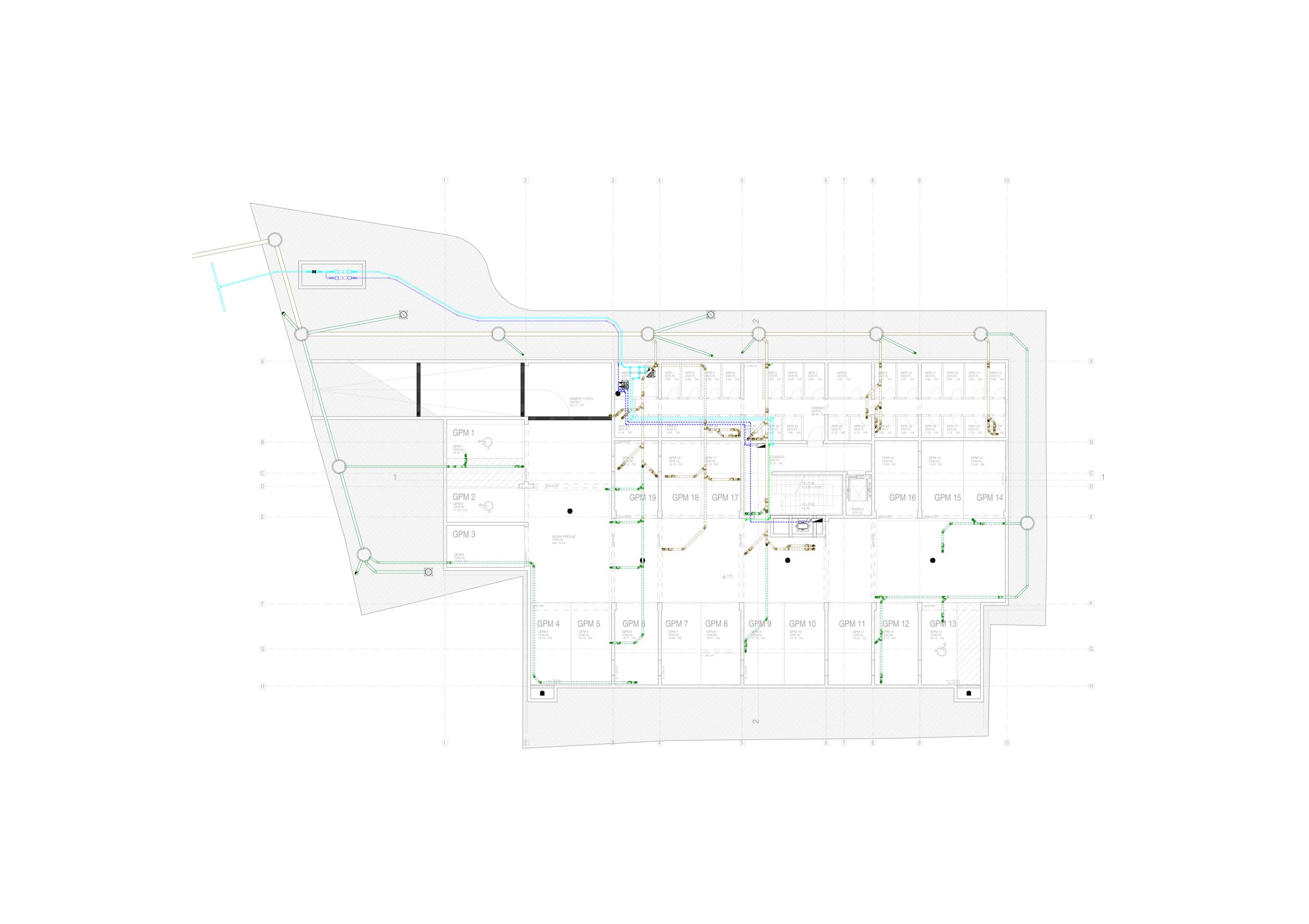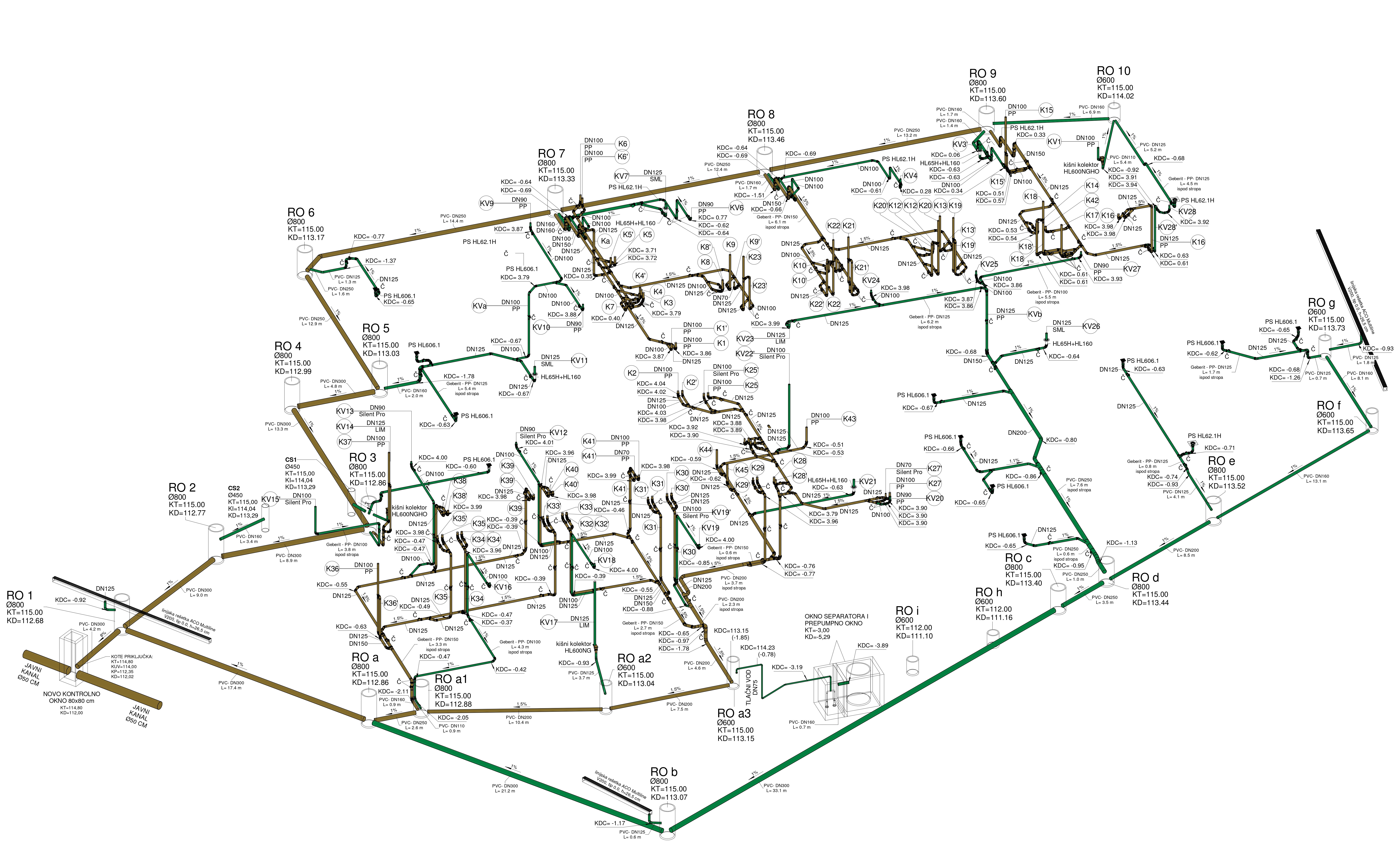 Glavni projekt razvija idejno rješenje u potpunu tehničku dokumentaciju potrebnu za građevinsku dozvolu. Ova faza uključuje detaljan prikaz vodovodne i kanalizacijske mreže, točne kote, promjere, padove i tehničke opise sustava, hidrauličke proračune i dimenzioniranje, te usklađenost s važećim zakonima i normama.